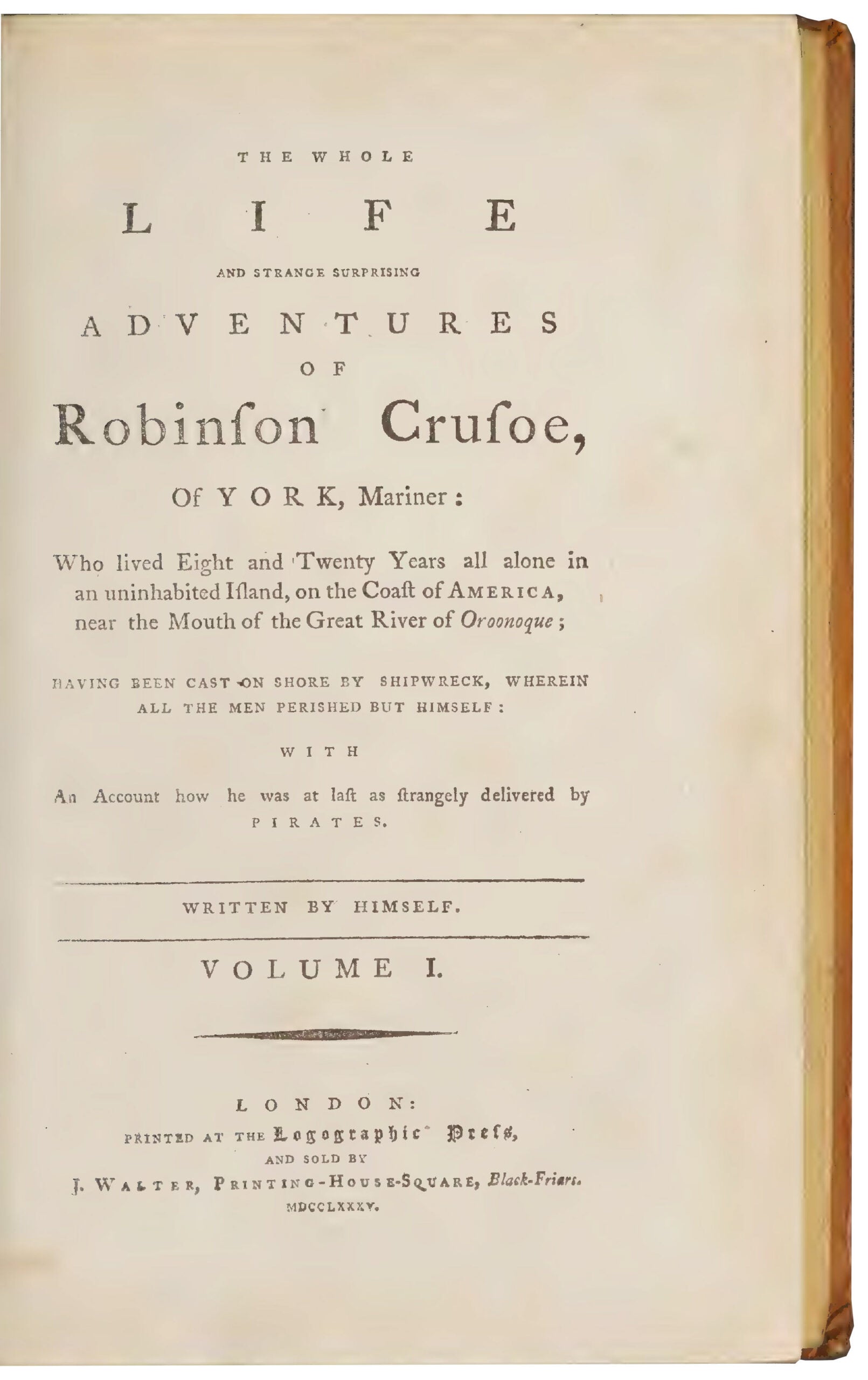 There was a debate about whether Robinson Crusoe should be in the collection because on the title page it says, “written by himself.” But it wasn’t written by Robinson Crusoe—it’s a literary imposture. It belongs in the Bibliotheca Fictiva because it was an imposture by its own author, Daniel Defoe.