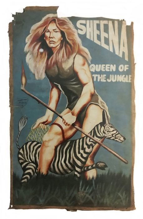 The cinema in 1980s Ghana was DIY: vans traveled from town to town with generators to power a VCR and a TV or maybe a projector. The titles were Hollywood imports on PAL and VHS tapes. As these independent “video clubs” operated far outside official distribution, area artists made the promotional posters, painting interpretations of box art or the storyline—usually with a dose of imagination—on flour sacks. As the religious studies scholar Birgit Meyer writes in Africa Today, before this era, when the government loosened its control of media “visiting the cinema had been largely limited to the elites and upper middle classes in the cities, and virtually the only films accessible to ordinary people had been the Government Information Services’ information films and mission societies’ biblical stories.”