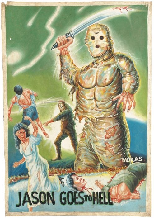 Often the foreign films were screened in open-air churches and the brightly colored posters made to sell tickets were infused with Pentecostal beliefs, even as they went heavy on the action and gore. “Baptized By Beefcake: The Golden Age of Hand-Painted Movie Posters from Ghana,” a new exhibition at the Poster House in New York City, explores this fusion of the spiritual with pop culture through the work of 22 artists from the 1980s and 90s. From the Terminator as a Christ figure in the battle between good and evil to a version of Evil Dead 2 that strays far from the source material to embody the dangers of the spirit world evoked by Pentecostal sermons, the films channeled local beliefs in promoting a new wave of film-watching.