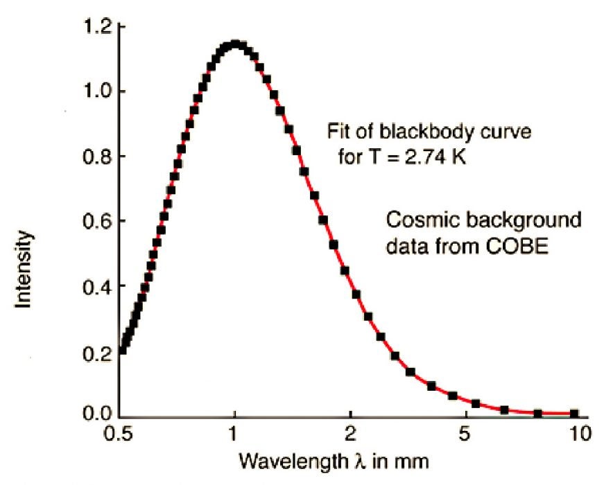 The COBE measurement of the so-called Cosmic Microwave Background (CMB), along with the fact that the universe is expanding, provides strong evidence for the Big Bang. According to the theory, the universe began 13.8 billion years ago at an unimaginable density and a temperature of billions of degrees. The Big Bang produced highly energetic short wavelength photons that survive today as relics of cosmic birth, although they have changed: as the universe cooled and expanded, the photons carried lower energies at longer wavelengths. Today, they fill a universe whose temperature is near absolute zero. The clincher is that the measured value, 2.725K, agrees with the theoretical prediction of 3K based on the Big Bang—a prediction made in 1965, shortly after Penzias and Wilson made their accidental discovery.
