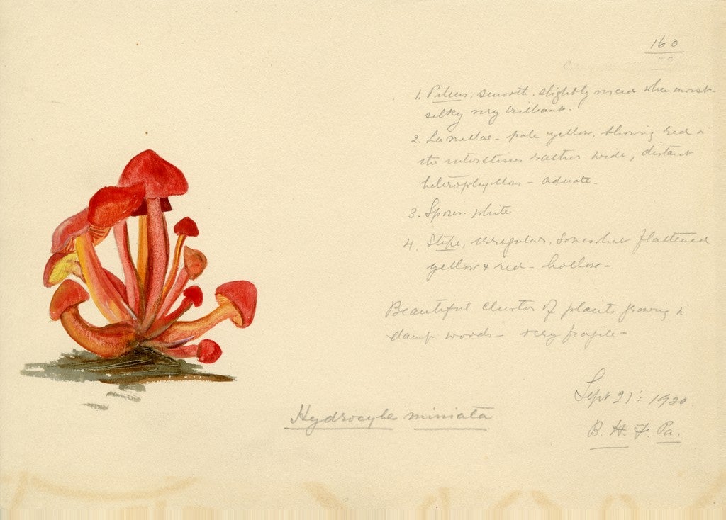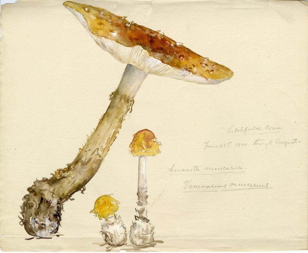 In the early 20th century, Violetta White Delafield began to study mushrooms. The American botanist and mycologist submitted over 600 fungal specimens to the New York Botanical Garden, which she was a member of. As part of her fieldwork, she also produced gorgeous drawings and watercolors of mushrooms she encountered in Pennsylvania, Connecticut, and at Montgomery Place, her country estate in New York, which is now part of Bard College. We spoke with curator Amy Herman about Violetta White Delafield and her drawings. The physical collection of drawings is held by Bard. You can browse the collection on JSTOR. SERIOUSLY, the drawings are mesmerizing and in these trying times, we daresay, healing. Check out all the drawings now.