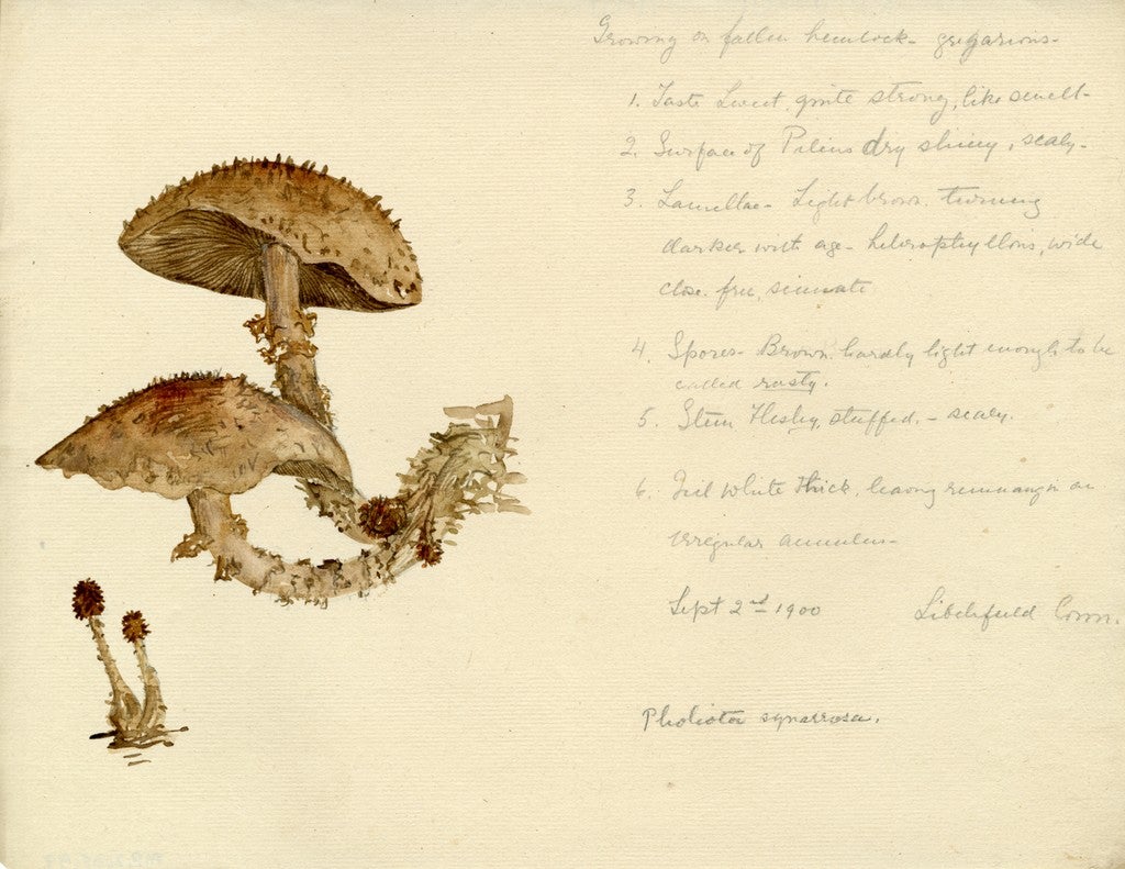 Although we can’t know her exact process, it seems likely that Violetta made the drawings on location prior to collecting the specimens. Fungal specimens often change color or lose scales and markings quickly after collection, so it would have been of utmost importance to capture the form and color accurately before removing them from their natural environment.